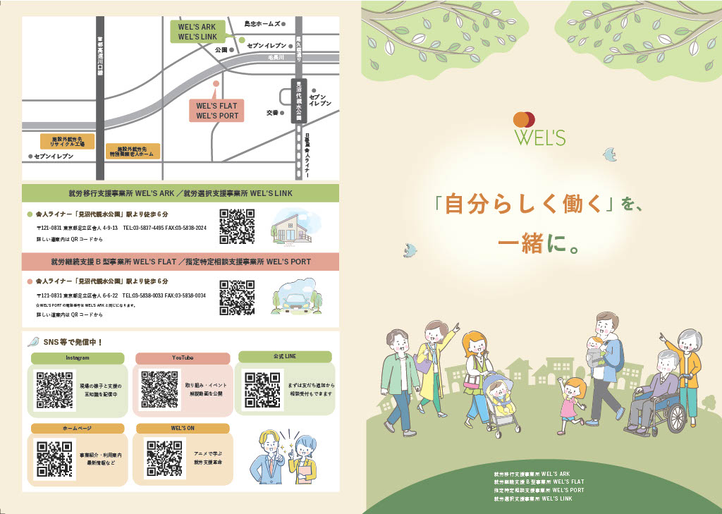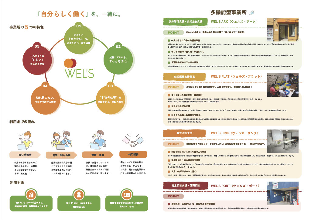 WEL’Sのパンフレットが新しくなりました! 2025/11/05 就労継続支援B型事業所 FLAT 皆様、いつもお世話になっております! この度、WEL’Sのパンフレットがリニューアルとなりました! 紙での配布は既に始まっており、こちらでWEBバージョンも掲載いたします。ぜひご覧ください!
